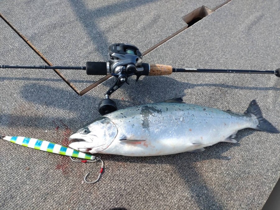 当日は、ボトム付近にサクラマスのアタリがあり、ボトムのマダラと中層のスケトウの間を狙う感じでした。