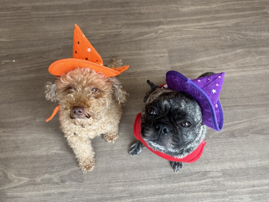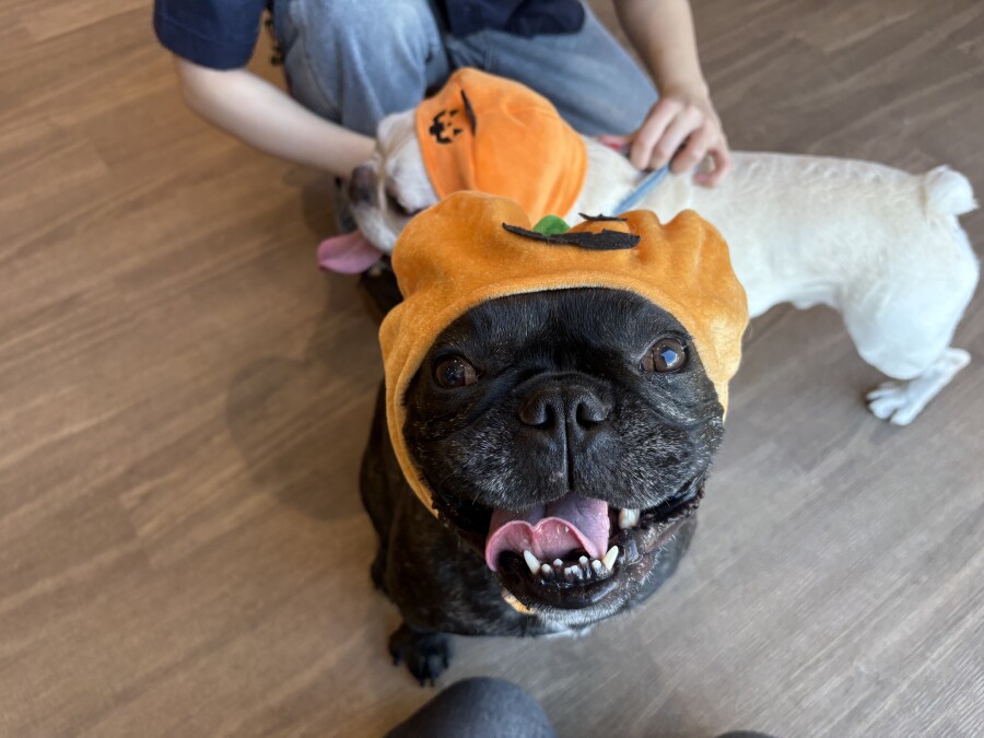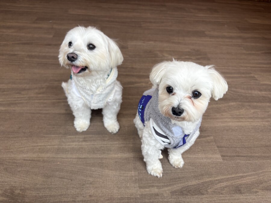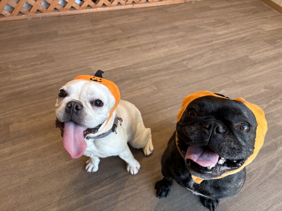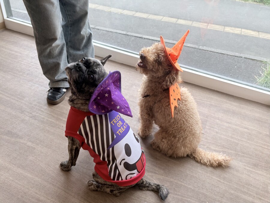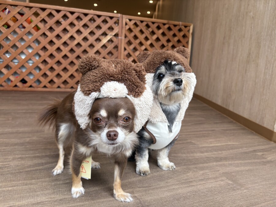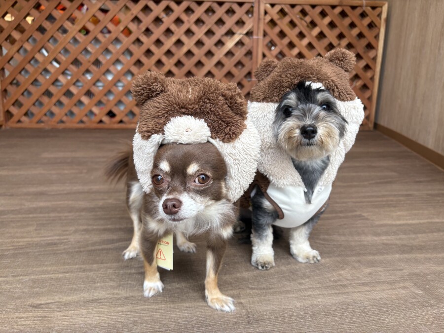 お勉強ではペアになっておそろいのお洋服や被り物をつけてみました✨