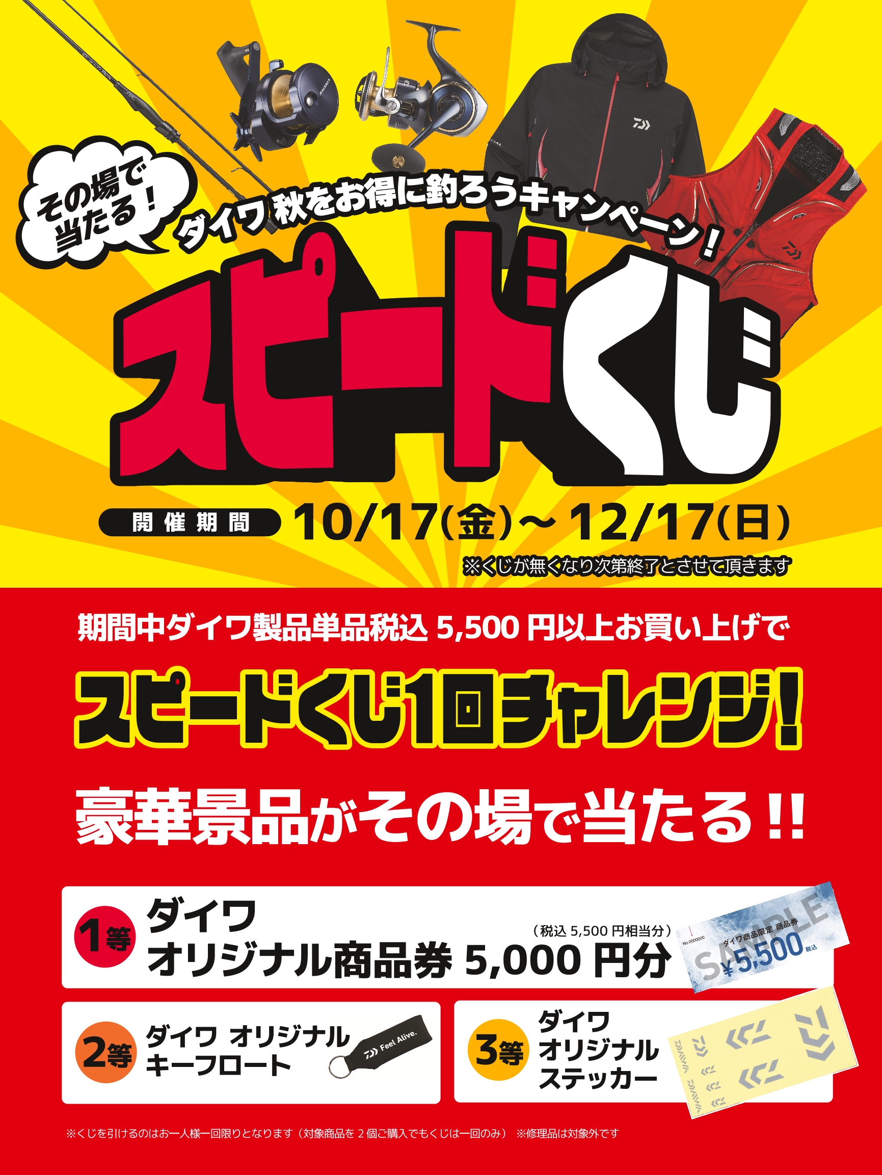 期間中ダイワ製品単品税込5,500円以上お買い上げで、その場でスピードくじにチャレンジ!