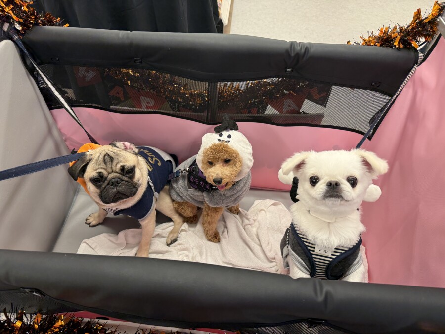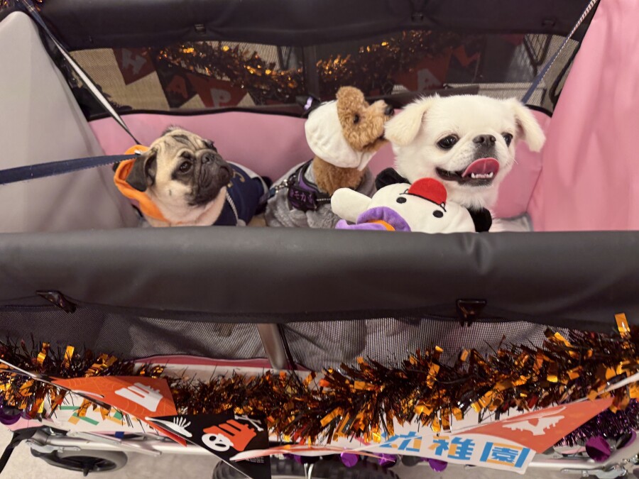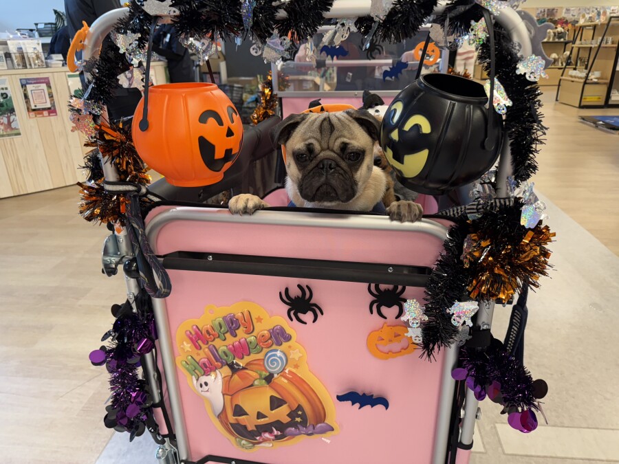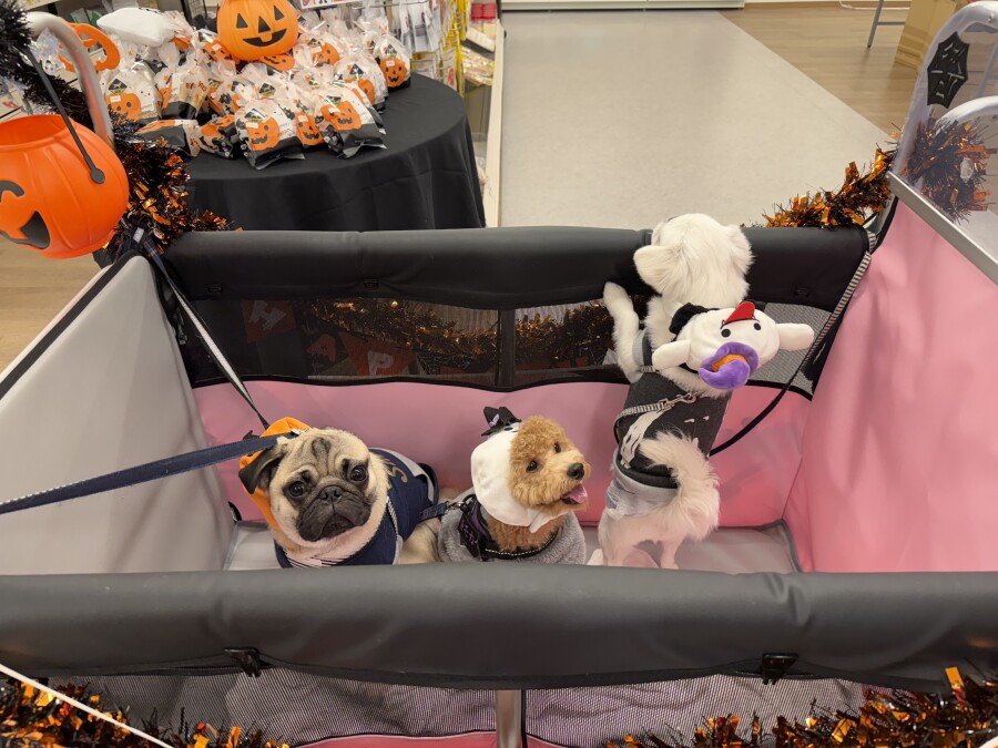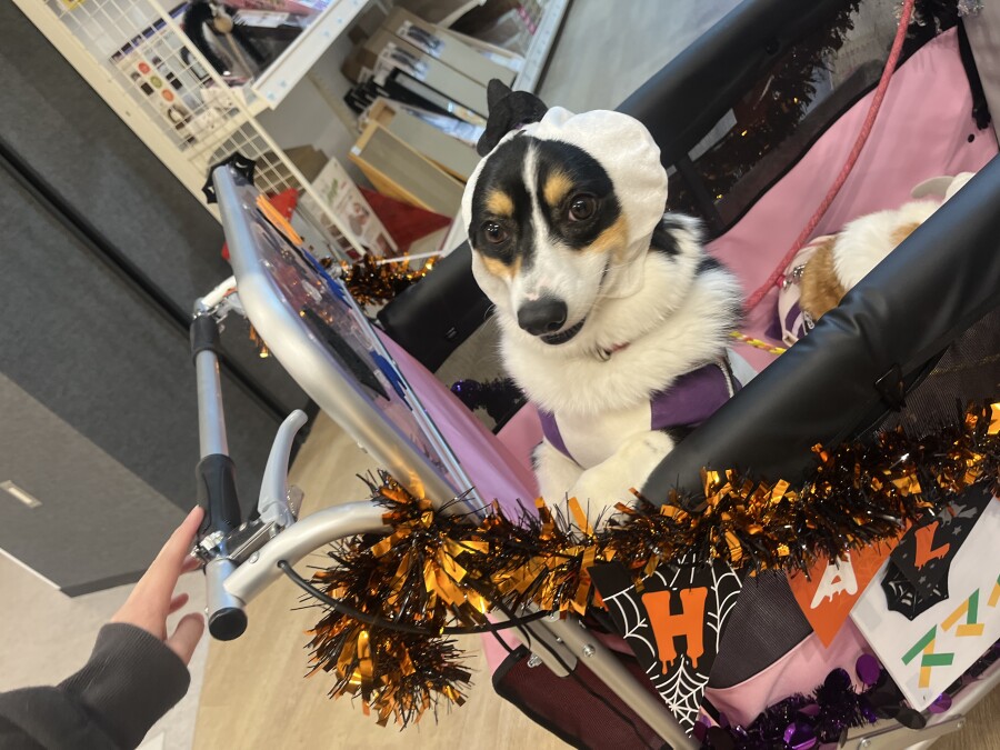 今日は仮装をして店内を幼稚園カートでお散歩しました♪