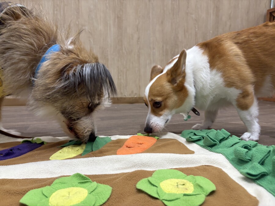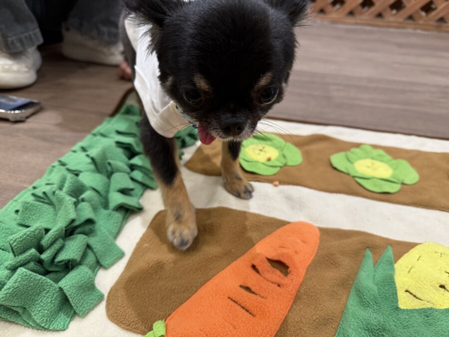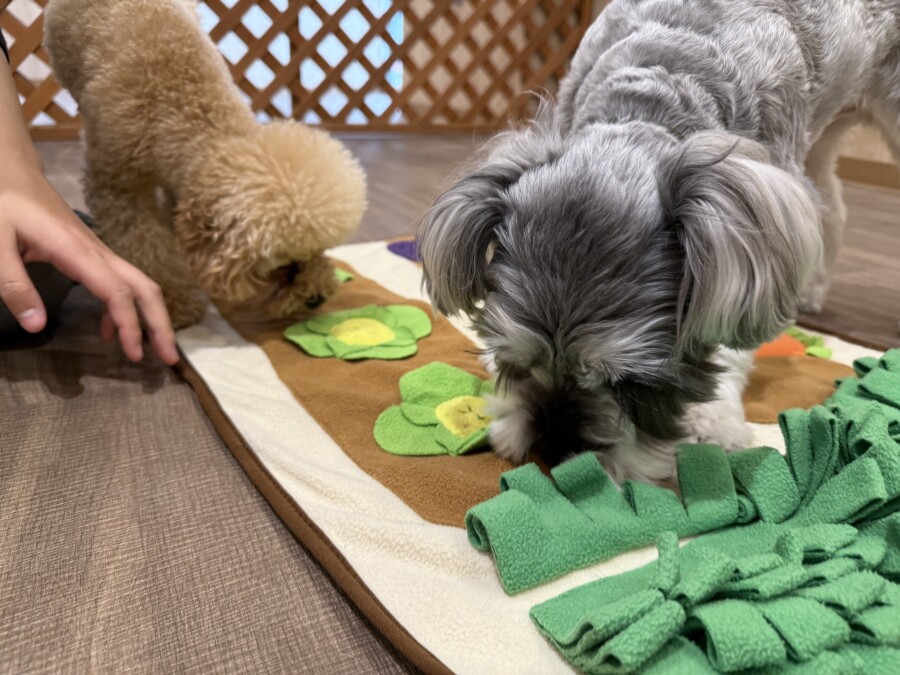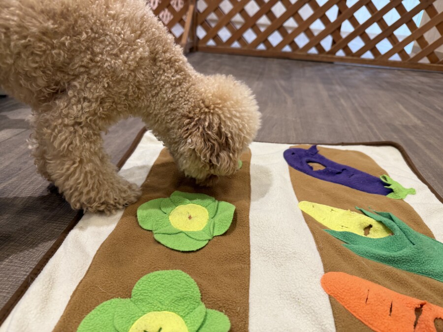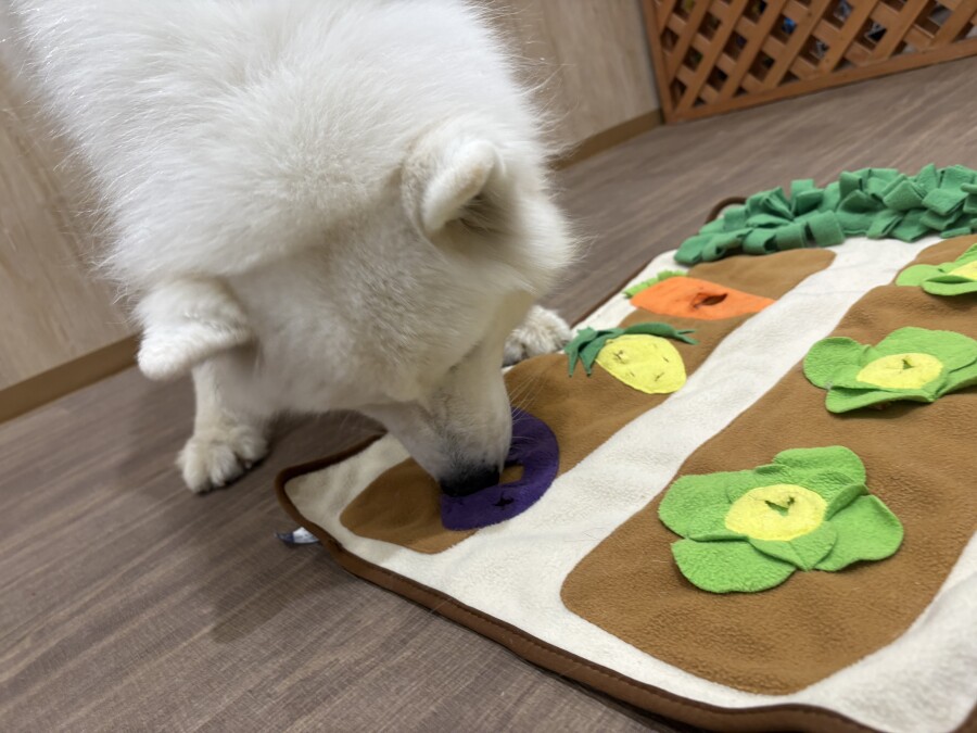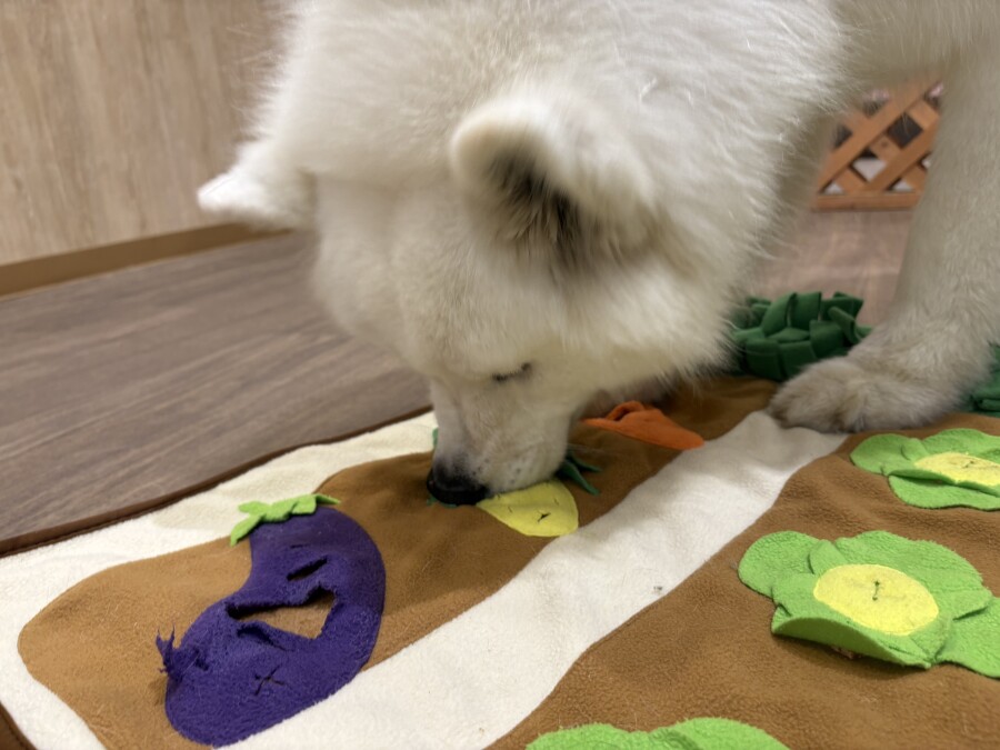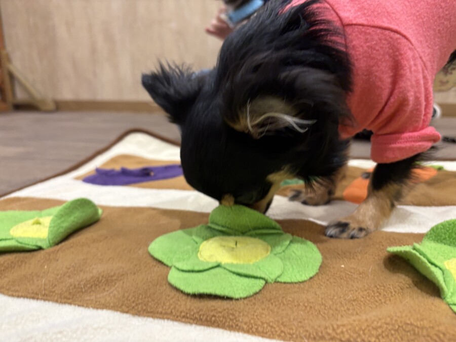 お勉強では狭くて取れないおやつは手を上手に使ったり布を引っ張ったりして上手におやつを探していました!