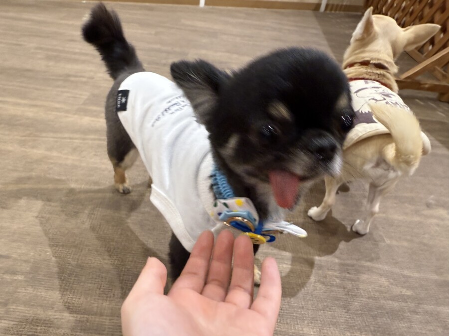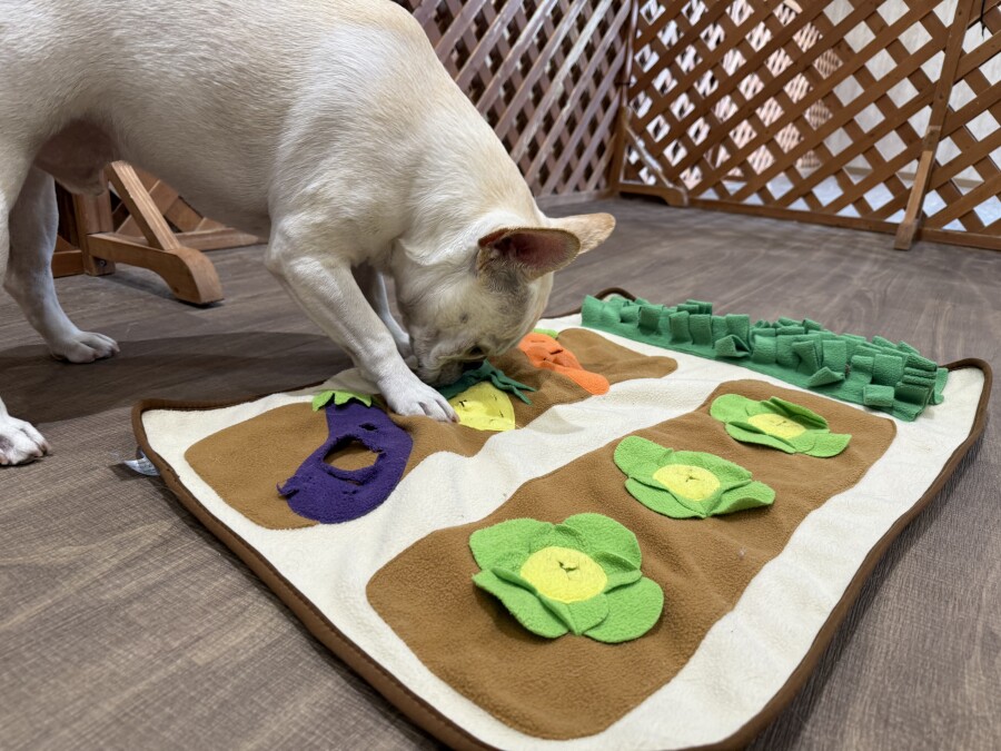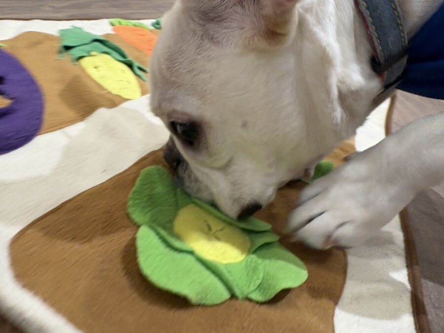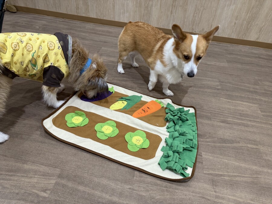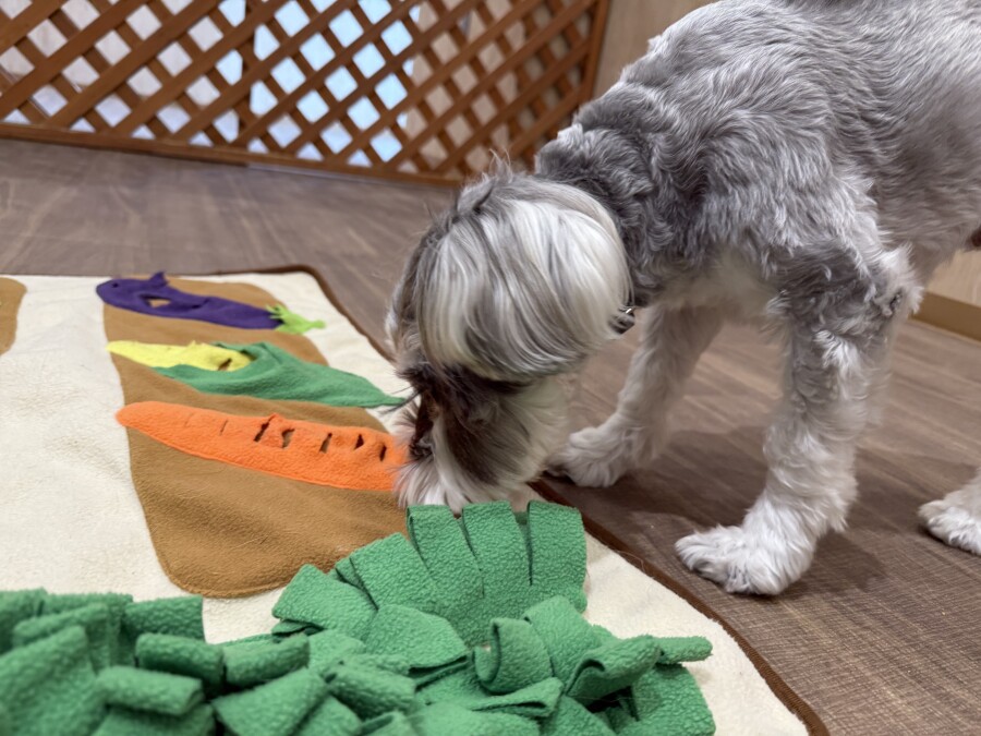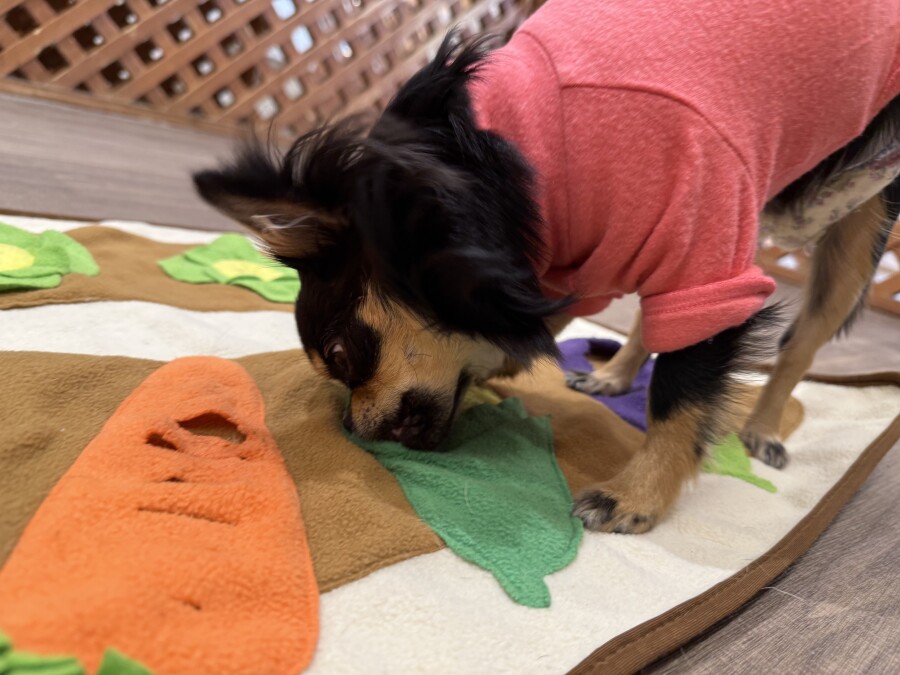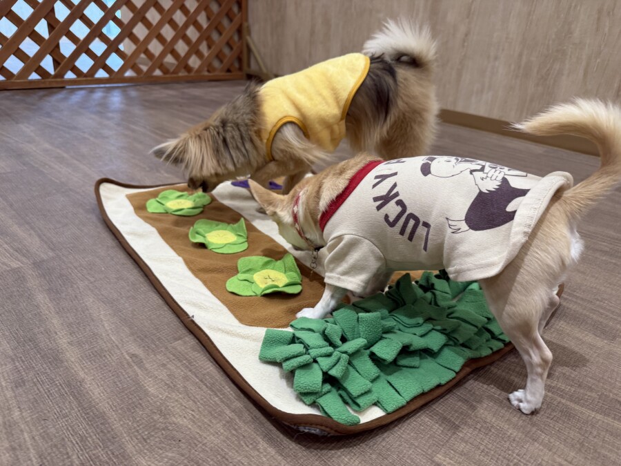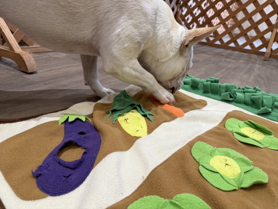 お勉強では狭くて取れないおやつは手を上手に使ったり布を引っ張ったりして上手におやつを探していました!