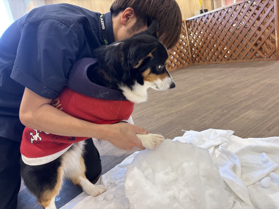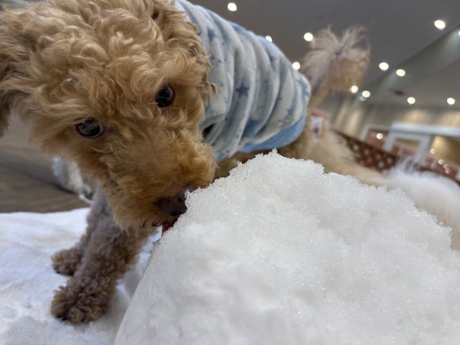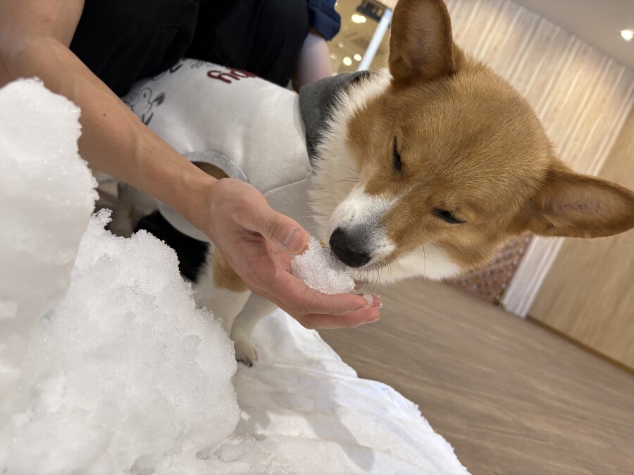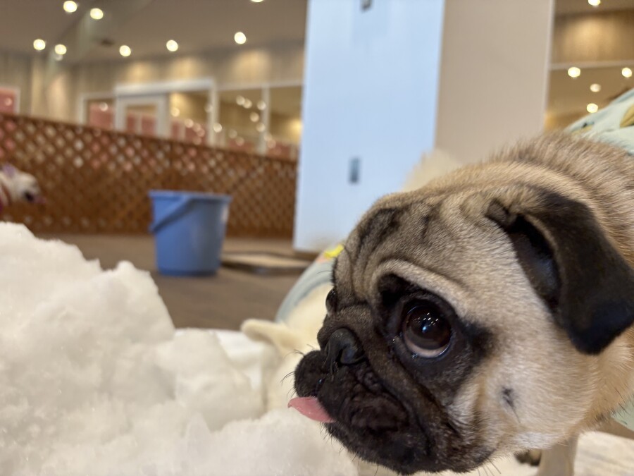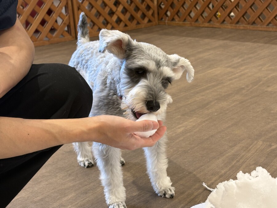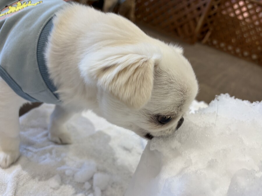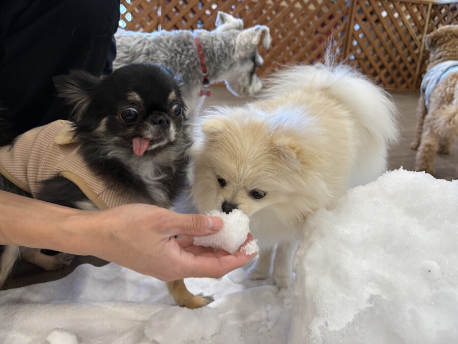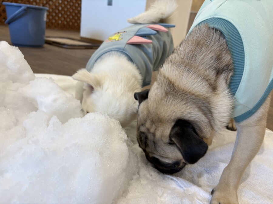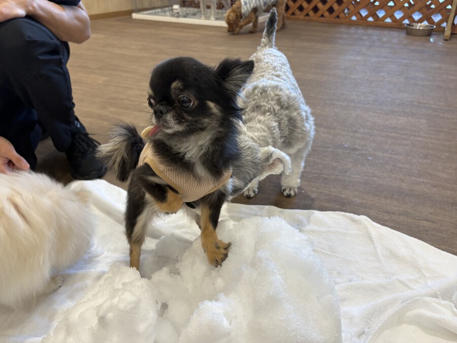 今週のお勉強は室内で雪に触れてみます!みんな室内に雪があると雪と認識しないのかパクパク食べたり近づかなかったりと反応は様々です!