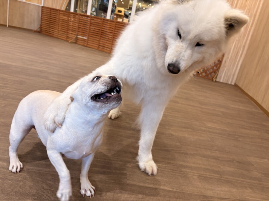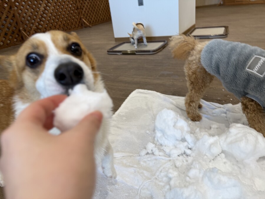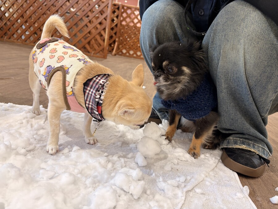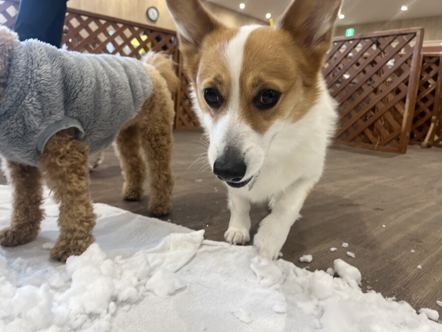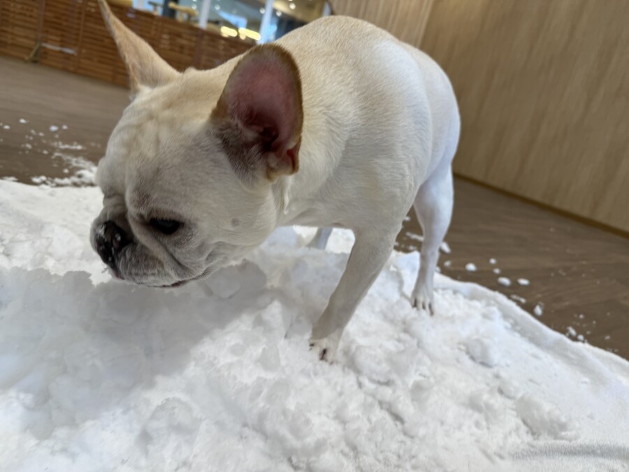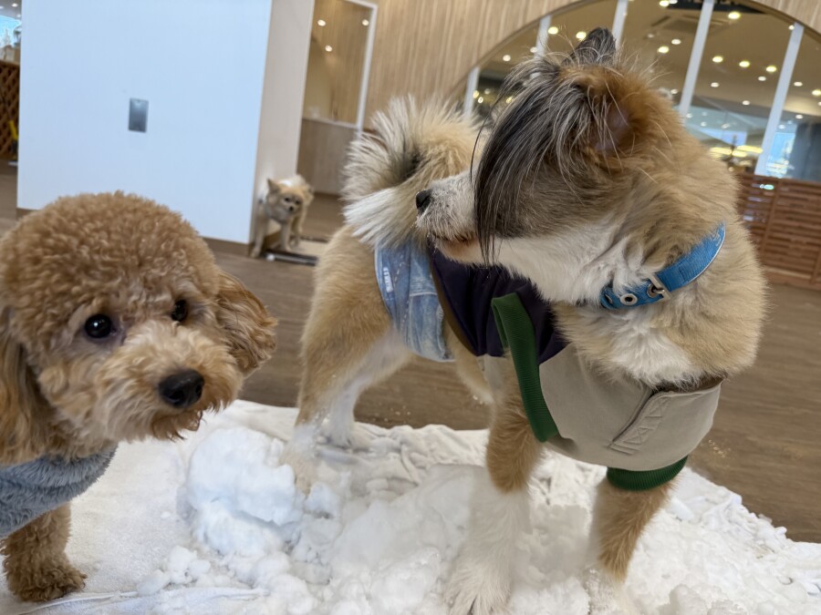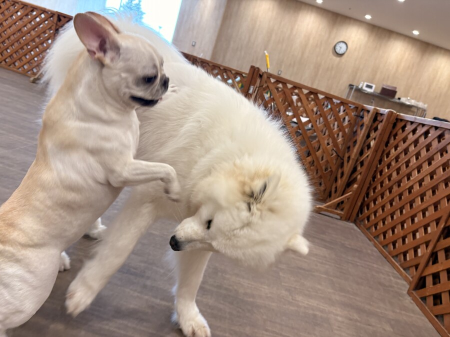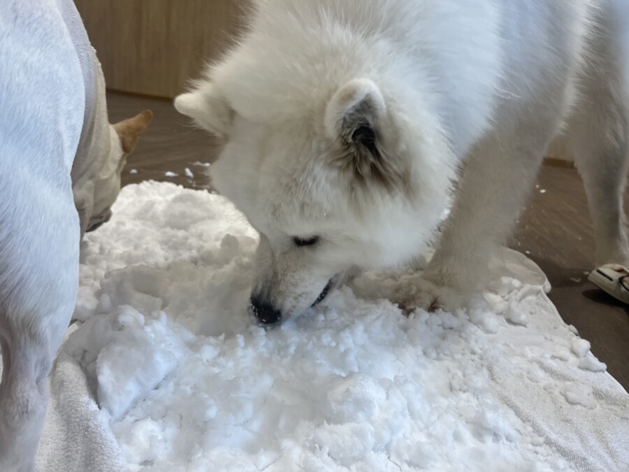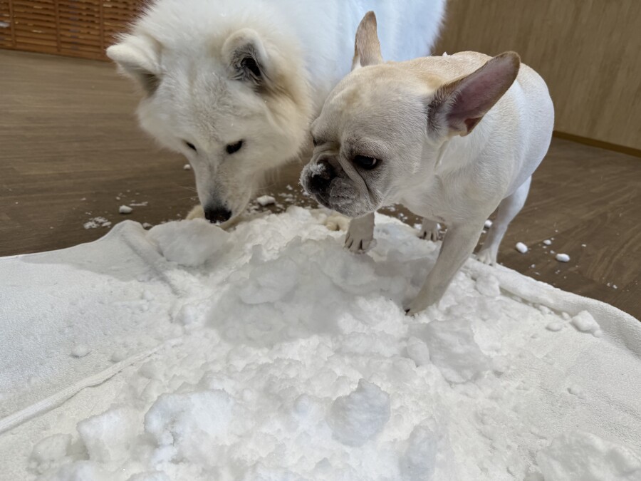 後半は雪の上でもお構いなしで遊び始めるフレンチブルドッグのキラくんとサモエドのゴン太くん∑(゚Д゚)