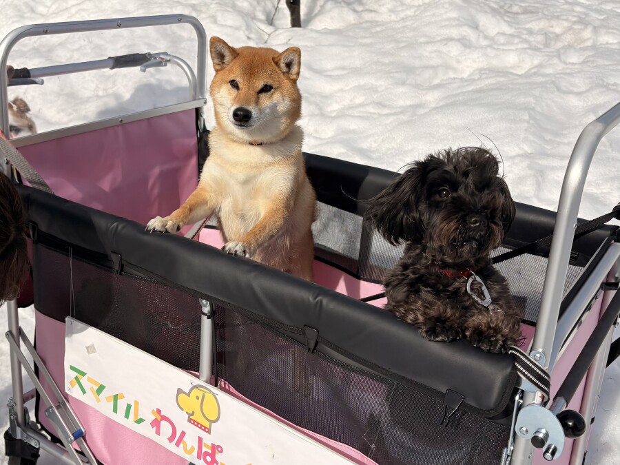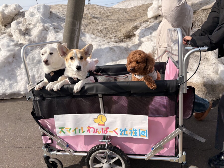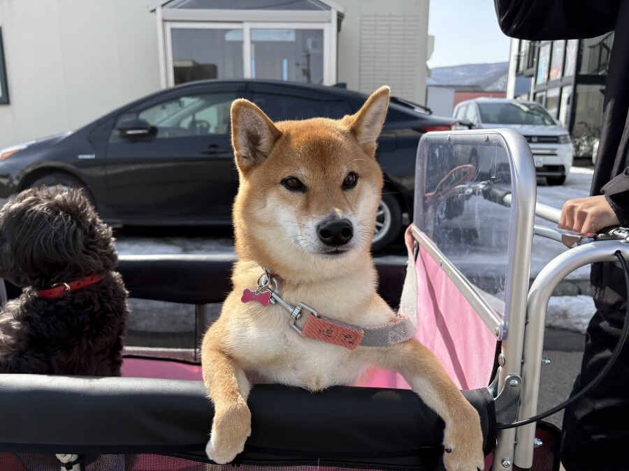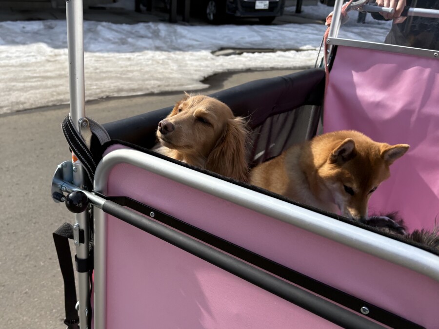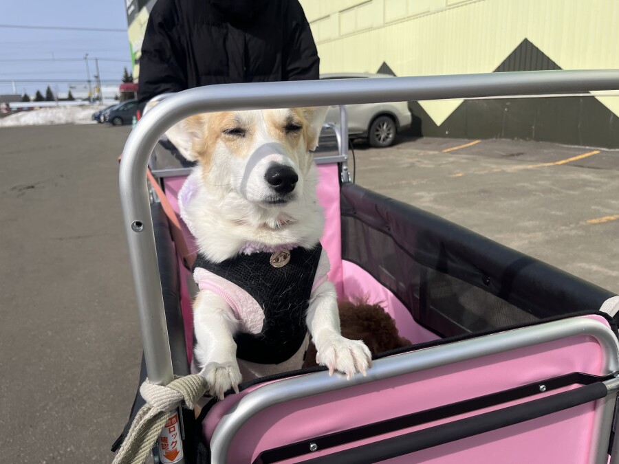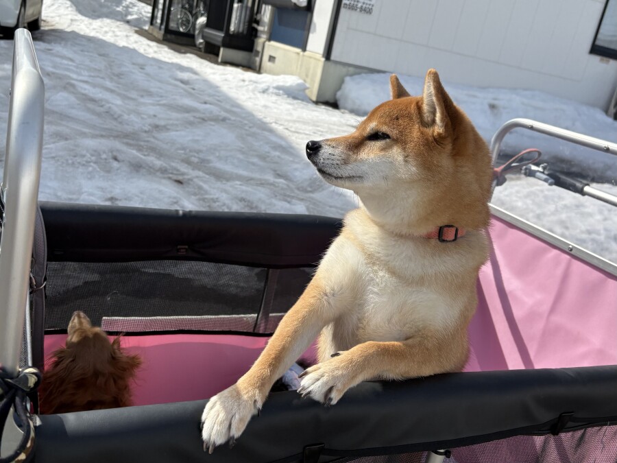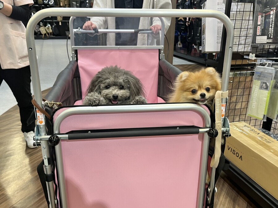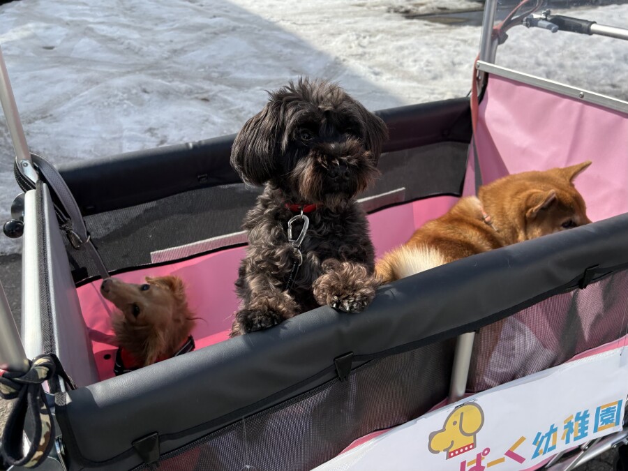 最近は雪が溶けて足元が悪いので、今日は幼稚園カートで店内の2階やお外に行ってきました☀︎