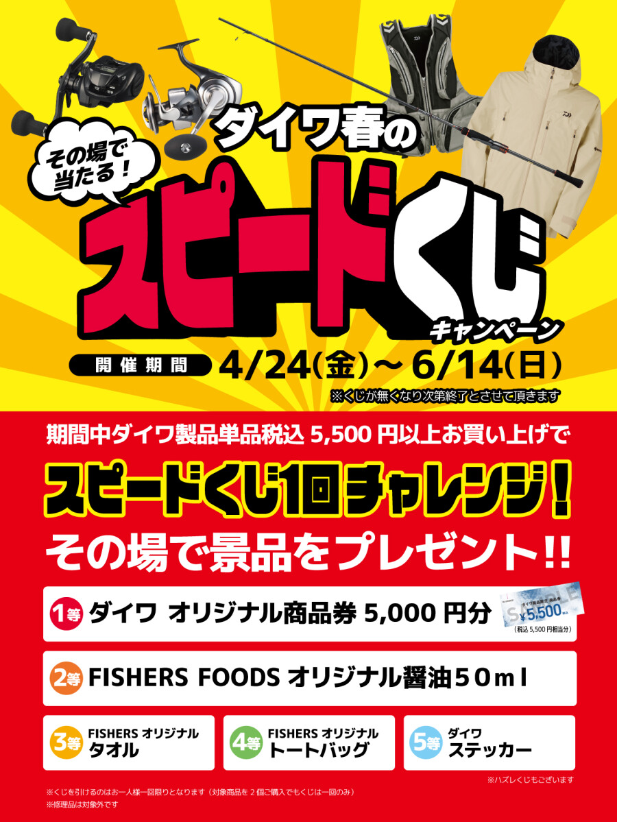ダイワ製品単品税込 5,500 円以上お買い上げでスピードくじに1回チャレンジ!
