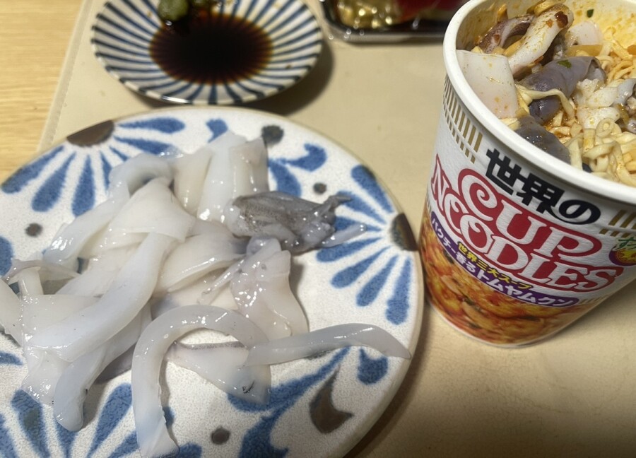 夕食は贅沢にアオリイカとカップラーメンで美味しく頂きました!!