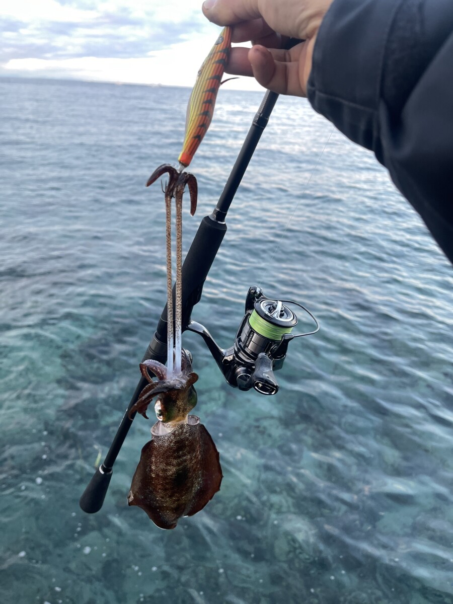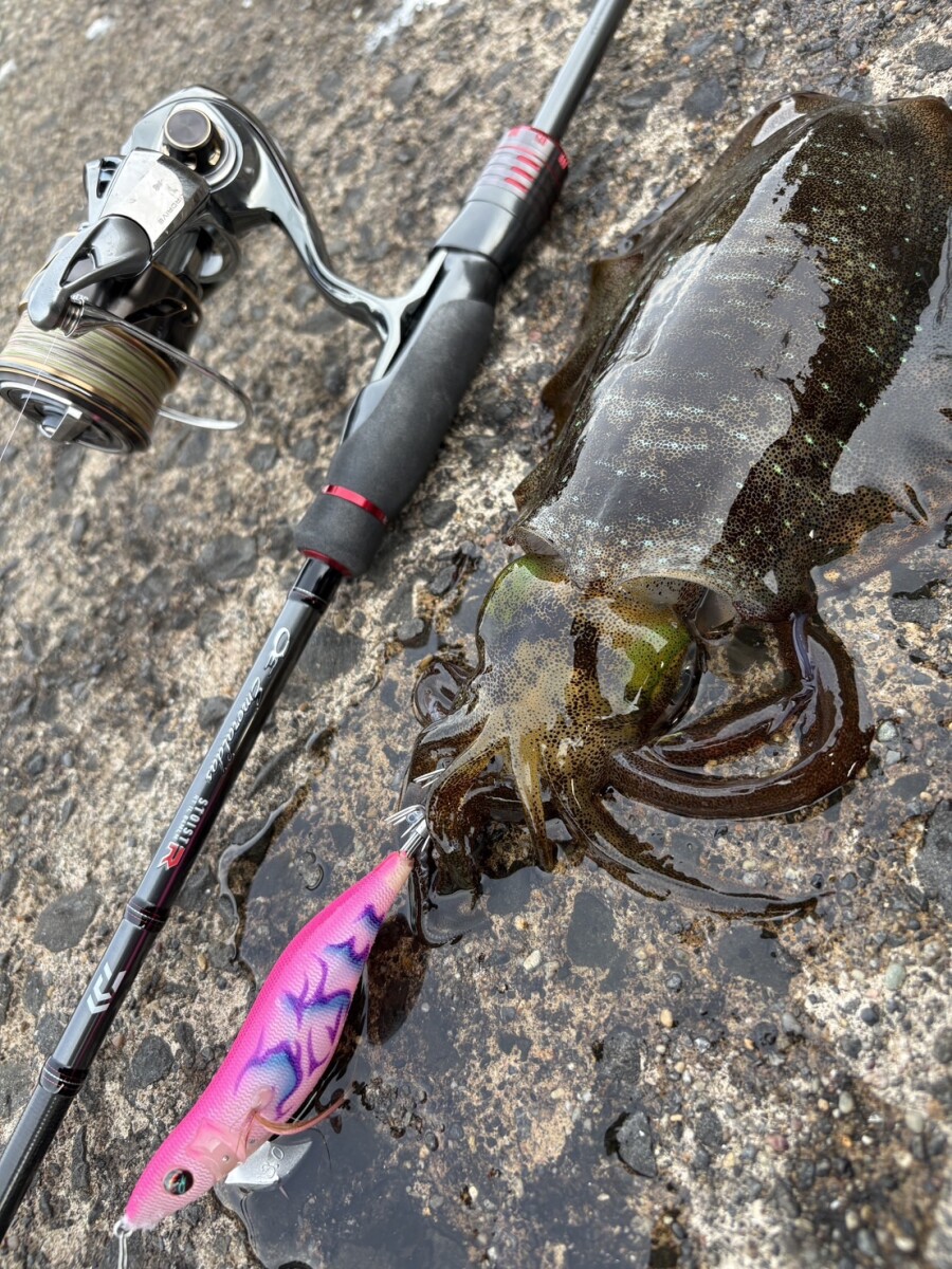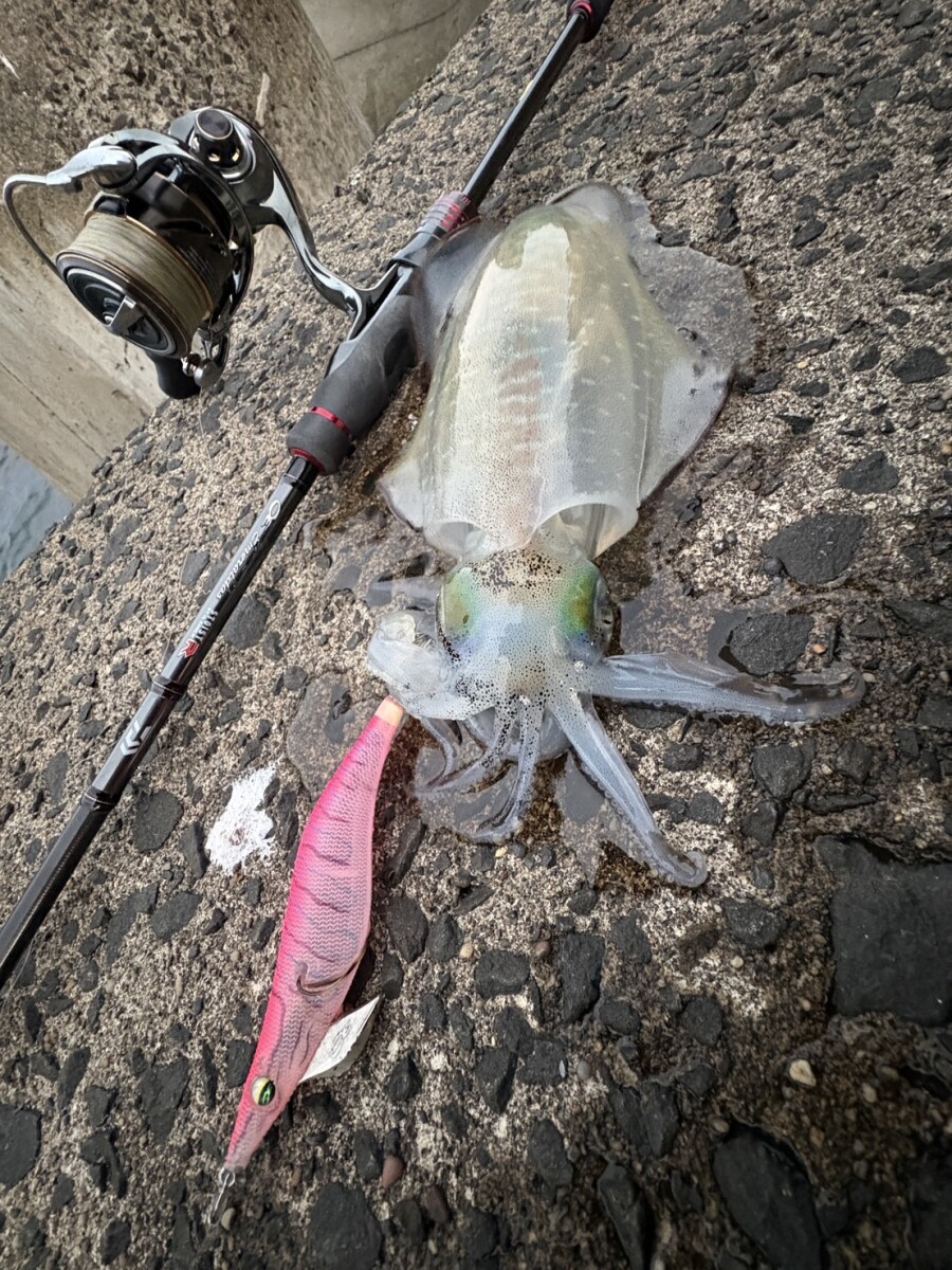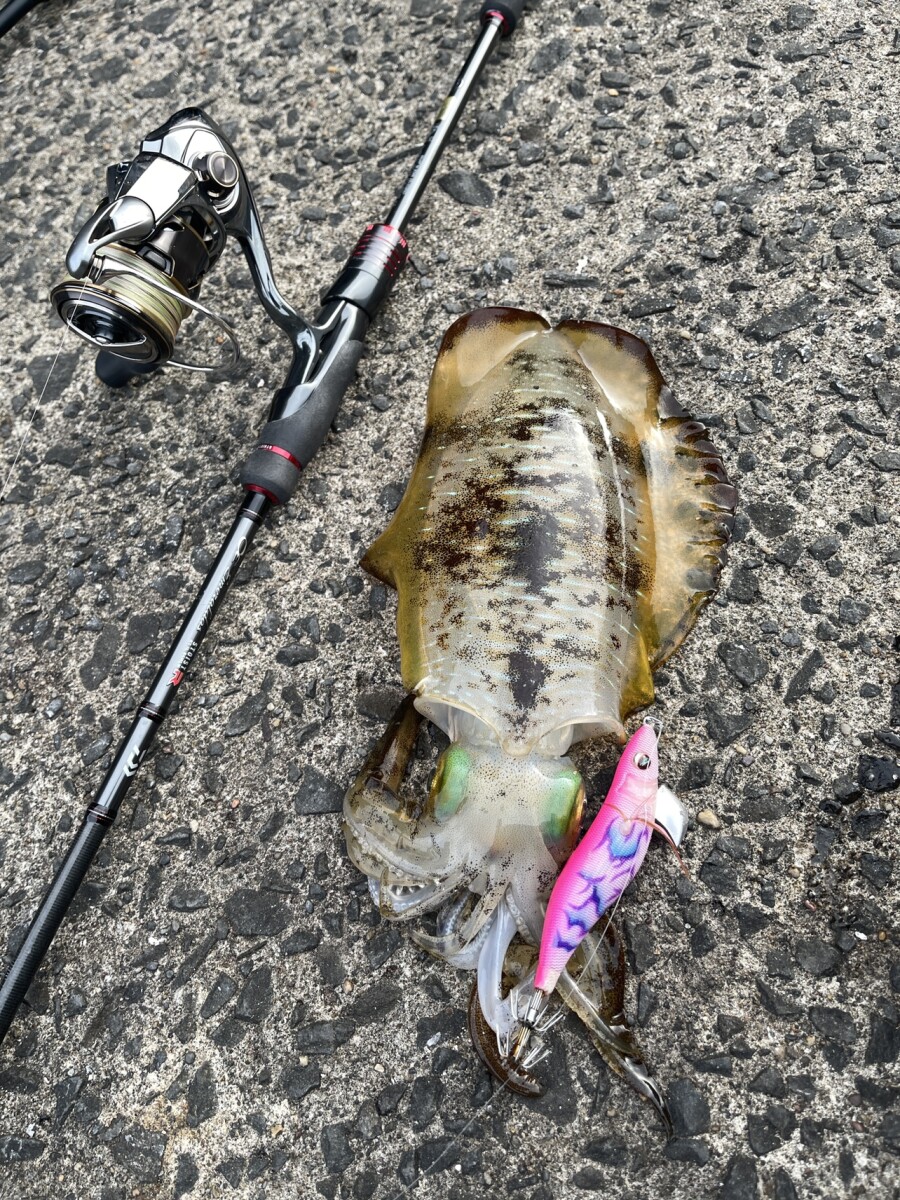 明暗の境目に【ダイワ】EMアモラスジョイントを使って探っているとまず1杯目、今年初のアオリイカがゲットしました!!
