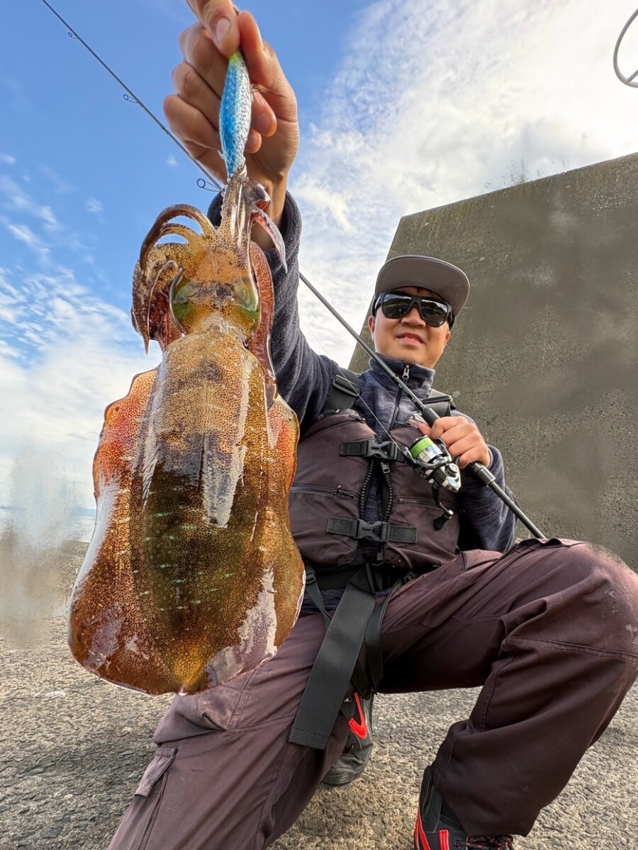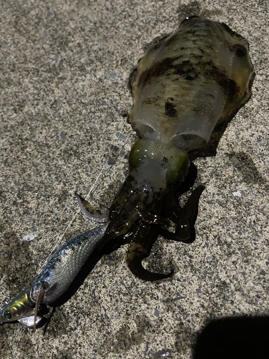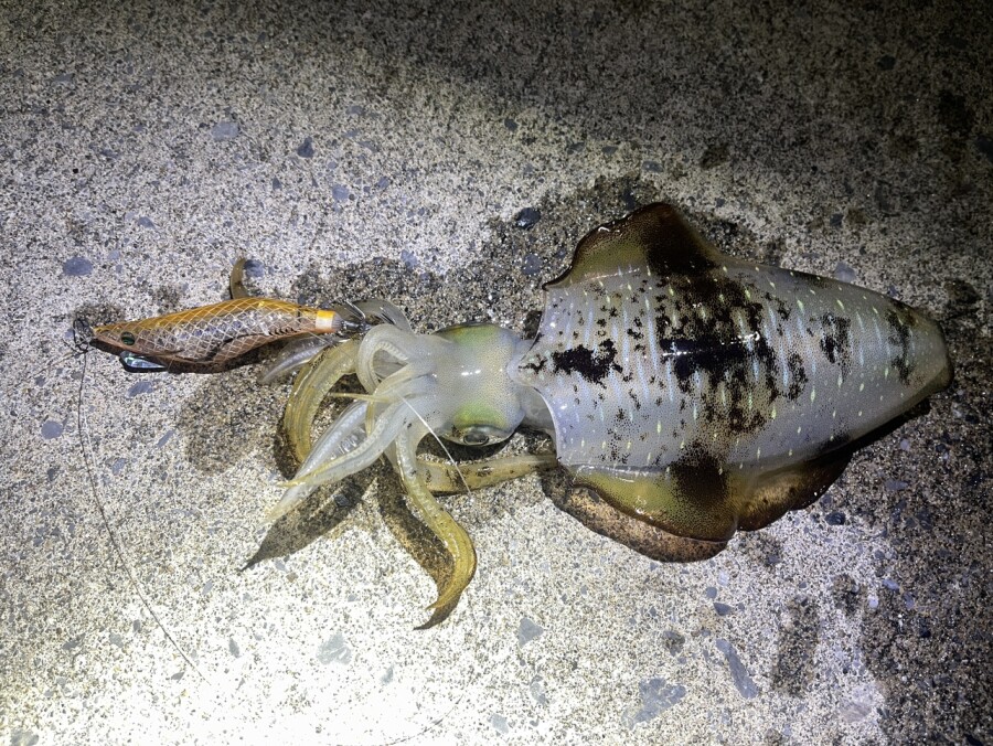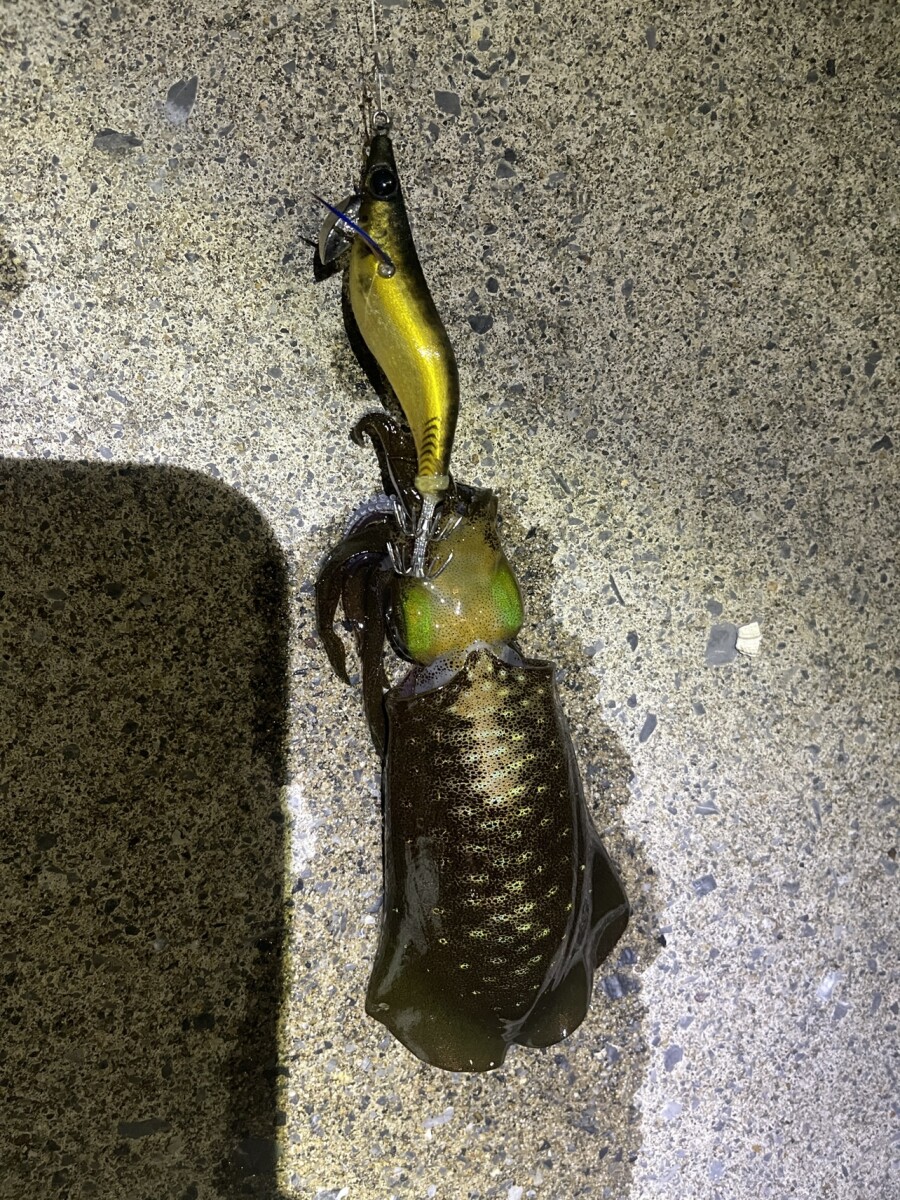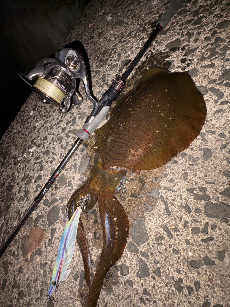 明暗の境目に【ダイワ】EMアモラスジョイントを使って探っているとまず1杯目、今年初のアオリイカがゲットしました!!