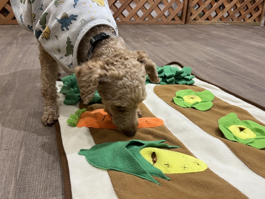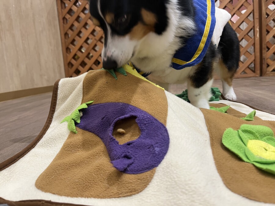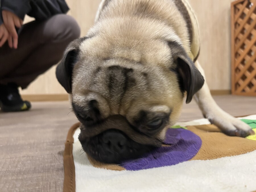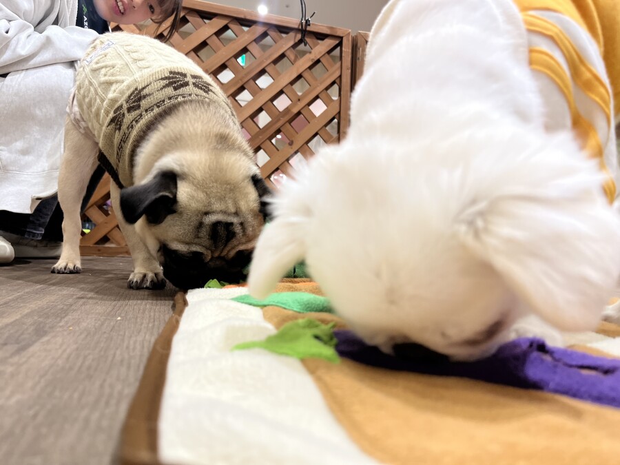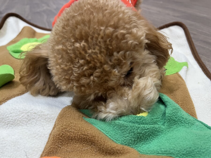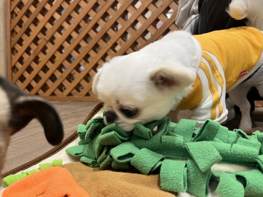 先週とは違うノーズワークのマットでしたがみんな必死に深い葉っぱの中をかき分けたりして上手に見つけられました!
