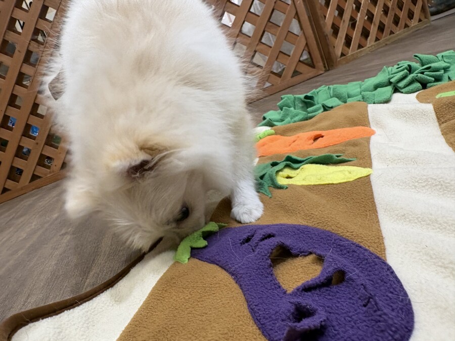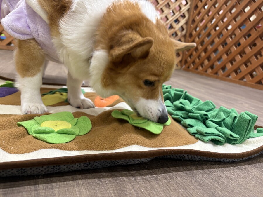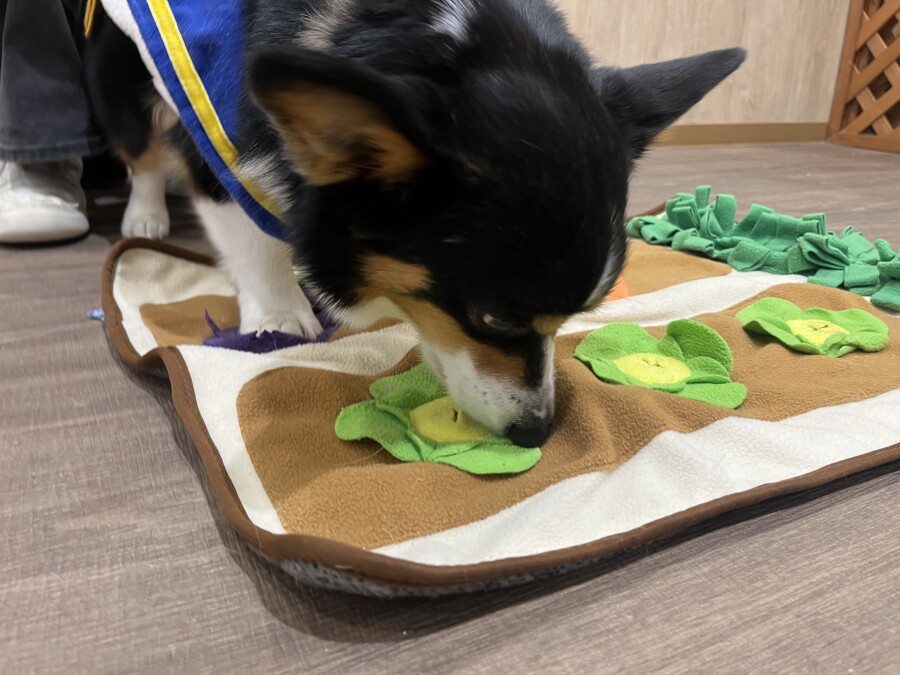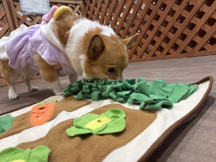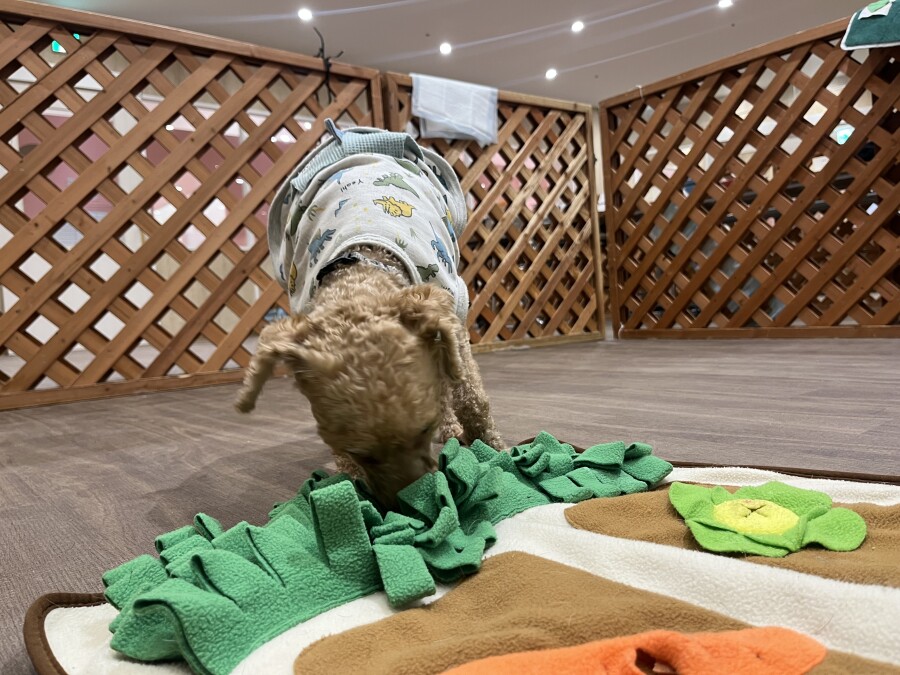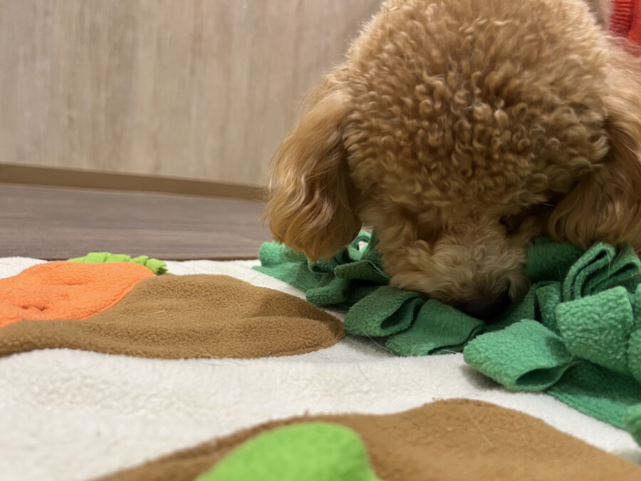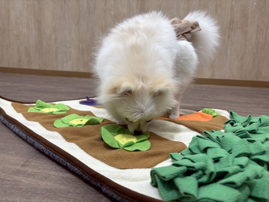 先週とは違うノーズワークのマットでしたがみんな必死に深い葉っぱの中をかき分けたりして上手に見つけられました!