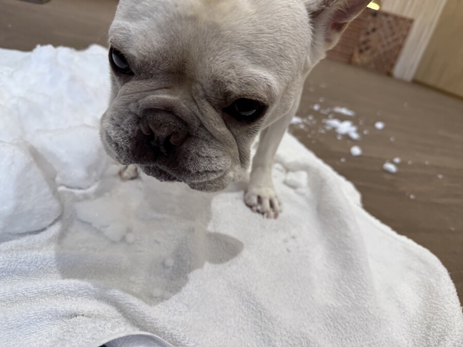 後半は雪の上でもお構いなしで遊び始めるフレンチブルドッグのキラくんとサモエドのゴン太くん∑(゚Д゚)
