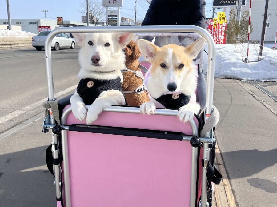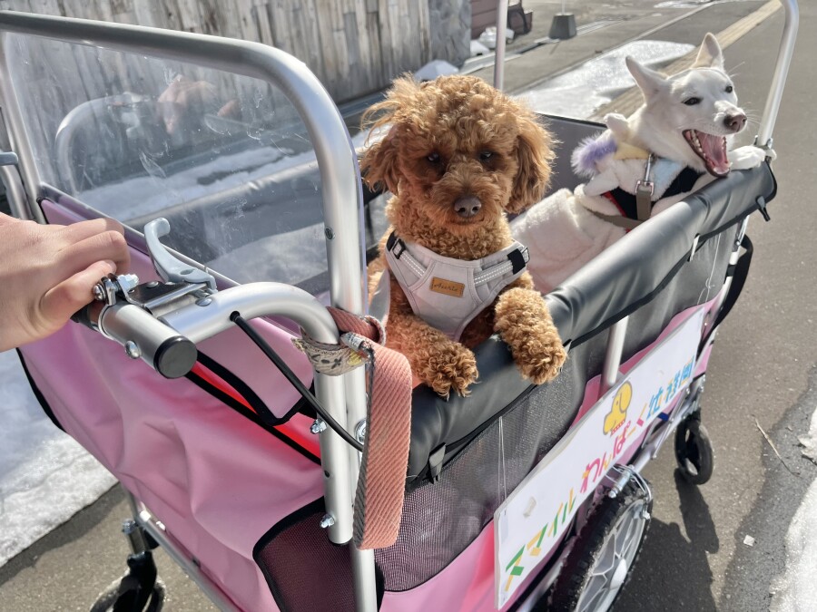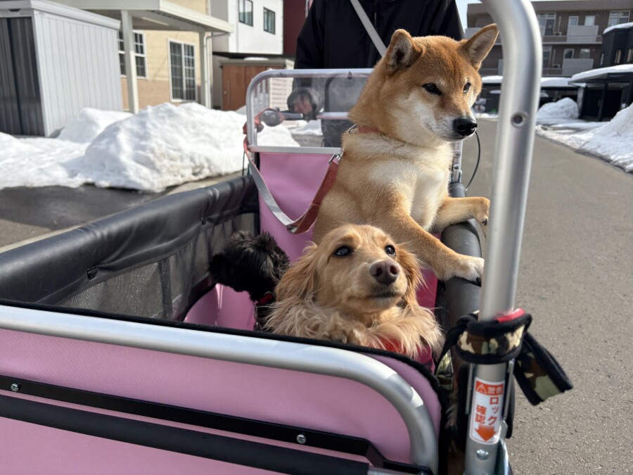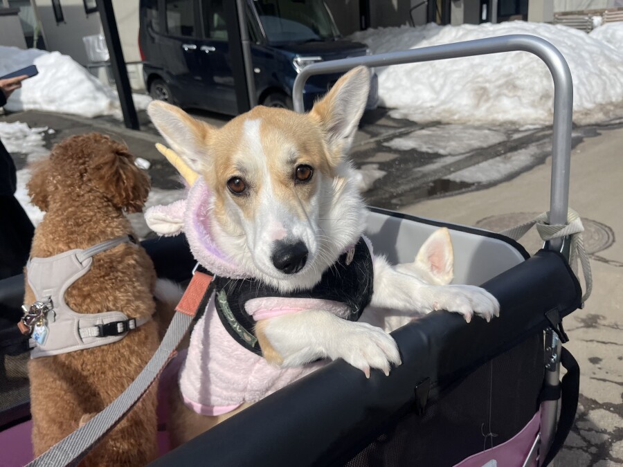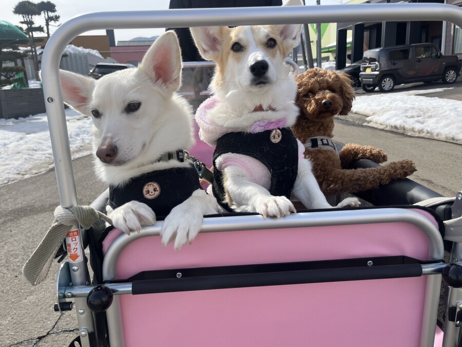 最近は雪が溶けて足元が悪いので、今日は幼稚園カートで店内の2階やお外に行ってきました☀︎