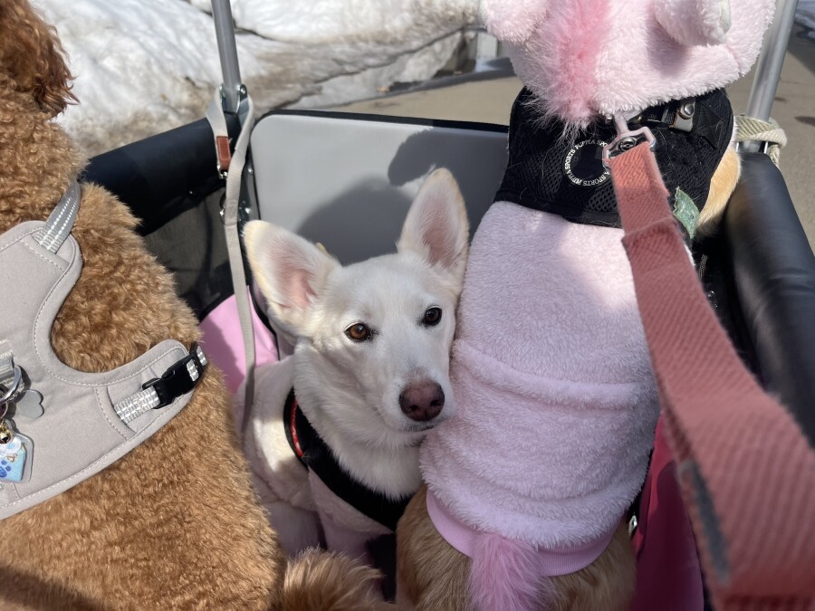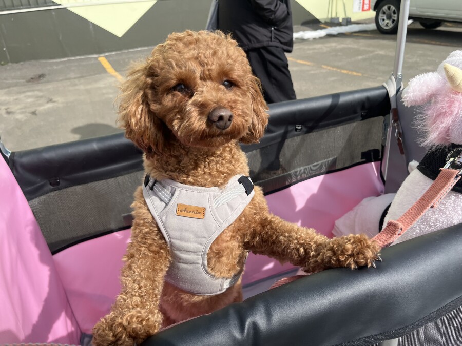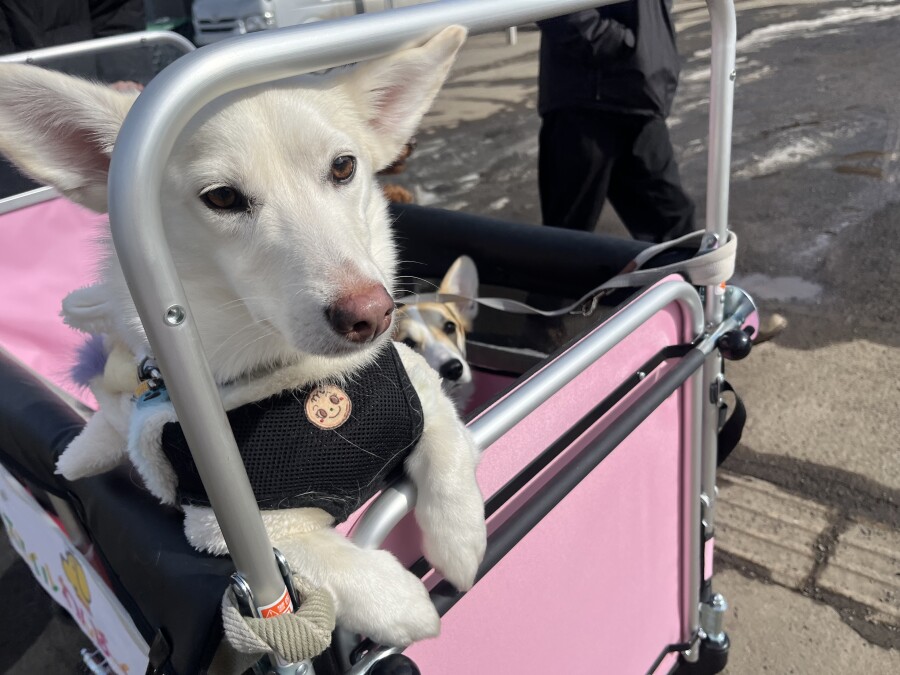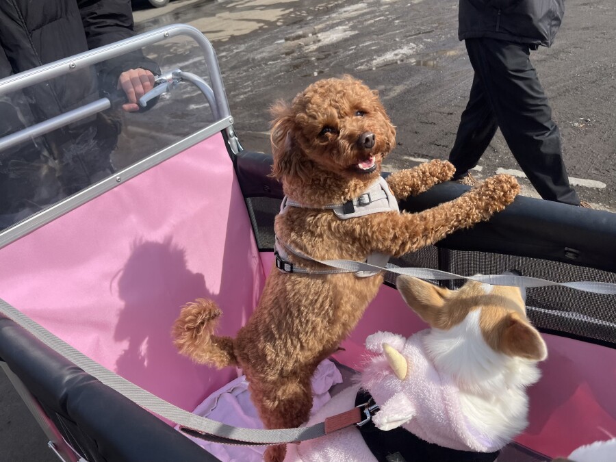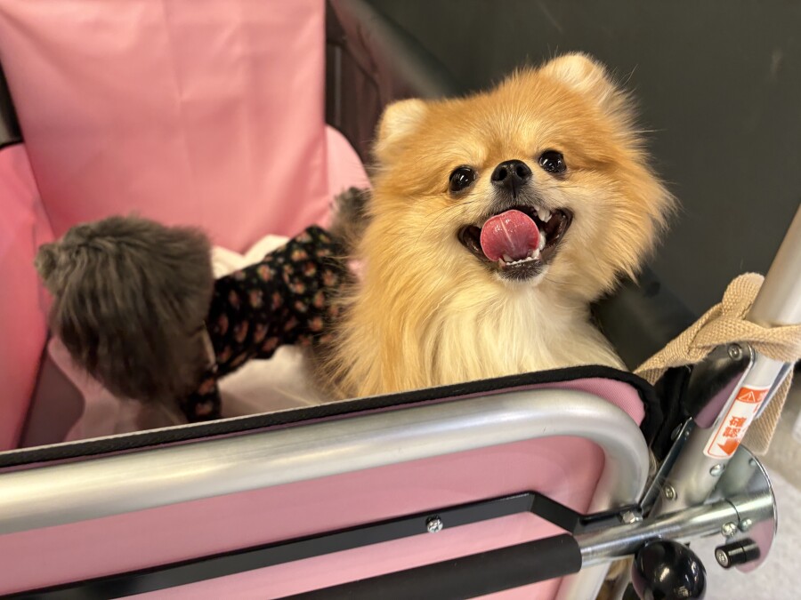 最近は雪が溶けて足元が悪いので、今日は幼稚園カートで店内の2階やお外に行ってきました☀︎